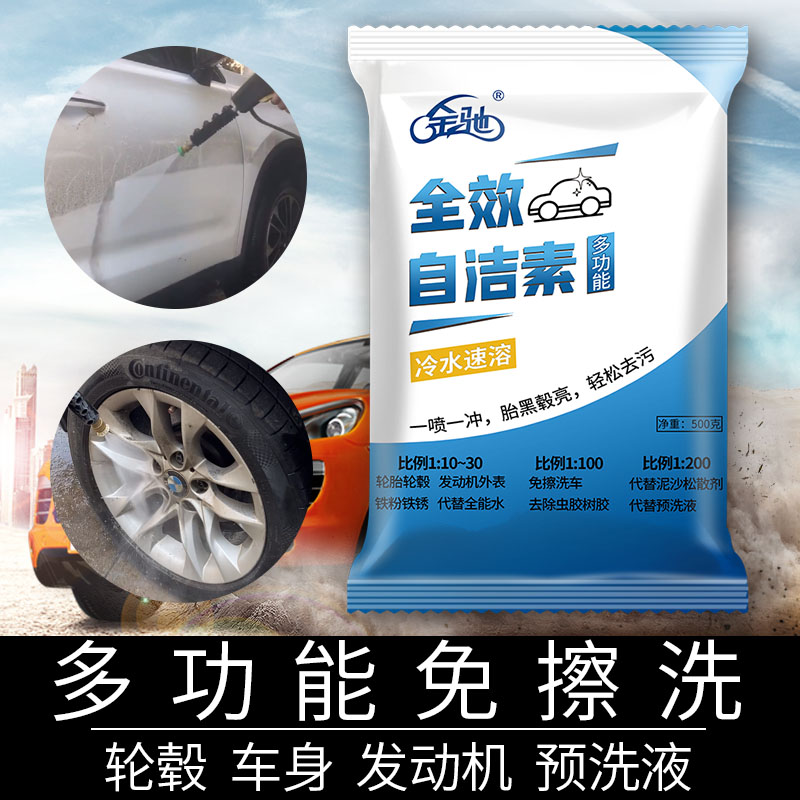 金馳全效自潔素是一種免擦拭多功能清洗劑,應(yīng)用較為廣泛,能夠快速去除輪胎、車身及車內(nèi)金屬表面氧化物、灰塵泥沙類污漬以及油類污漬,而且安全、環(huán)保、經(jīng)濟(jì)適用,不傷車漆及輪胎輪轂。